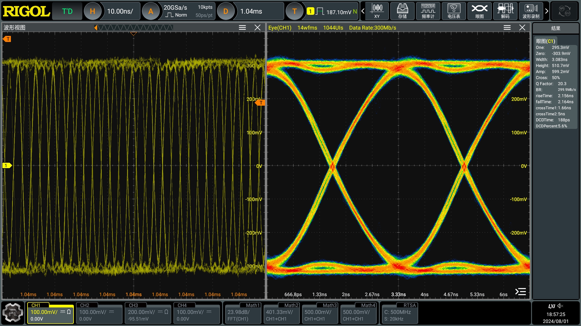 With its built-in pattern generator, the instrument can output pseudo-random bit sequences (PRBS2–PRBS32) or user-defined patterns at up to 300 Mbaud. This offers a direct, reliable signal source for eye-diagram and BER testing of high-speed serial buses and digital-interface receivers.