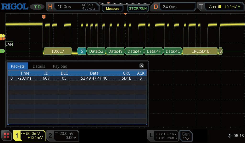 Rich serial protocol decoding can decode two serial buses simultaneously. The full-memory data analysis and the display of the decoding event table can help engineers quickly discover system faults and locate the error code waveforms, greatly improving the debugging efficiency of the overall system signals.
